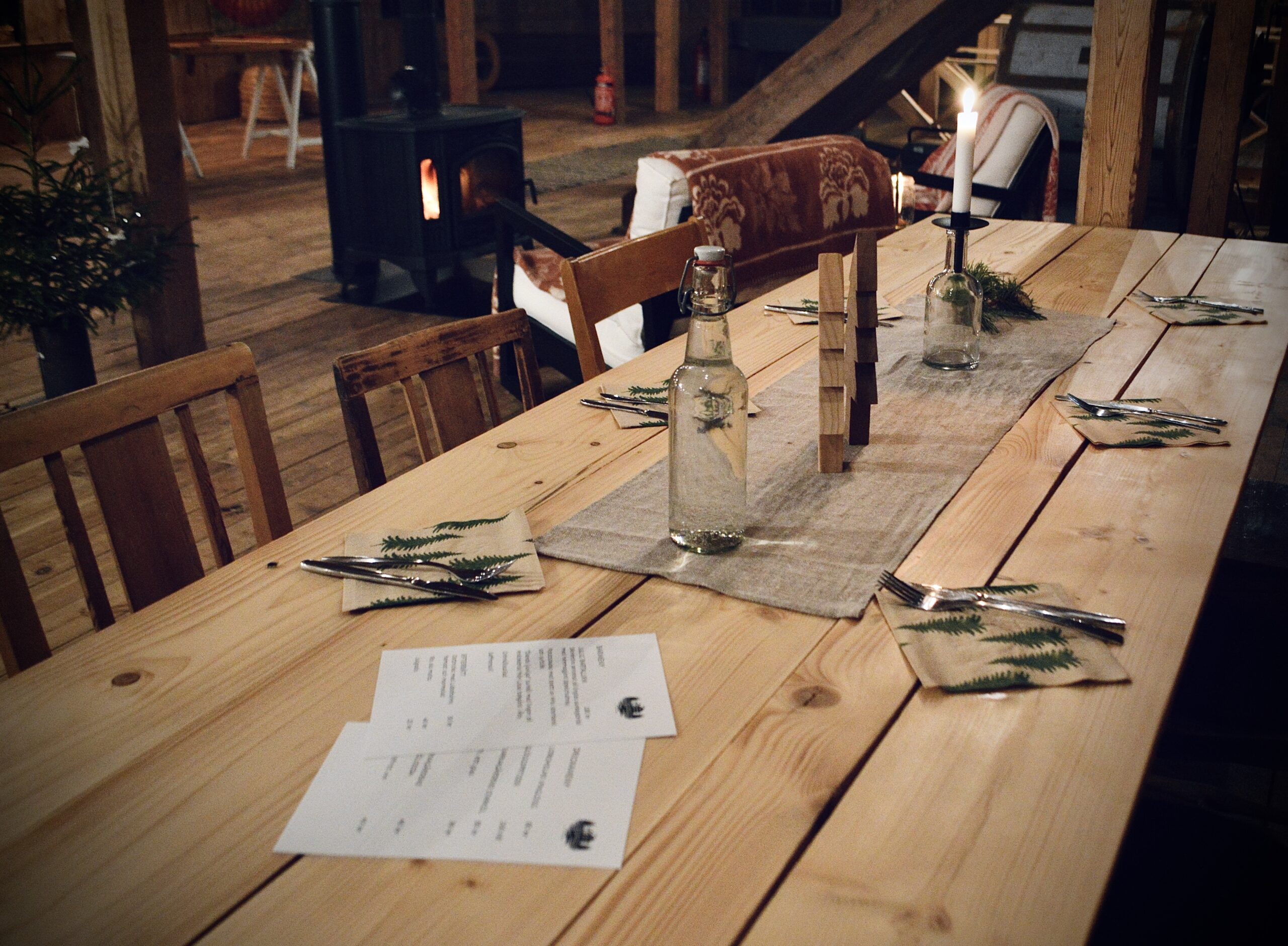 Vårt kök är vinterbonat och tänkt att rymma ett 10-tal personer för umgänge och matlagning tillsammans. I köket finns pizzaugn, vanlig spis och ugn samt vedspis. Det finns ett väl valt men udda och charmigt porslin för 70 personer.