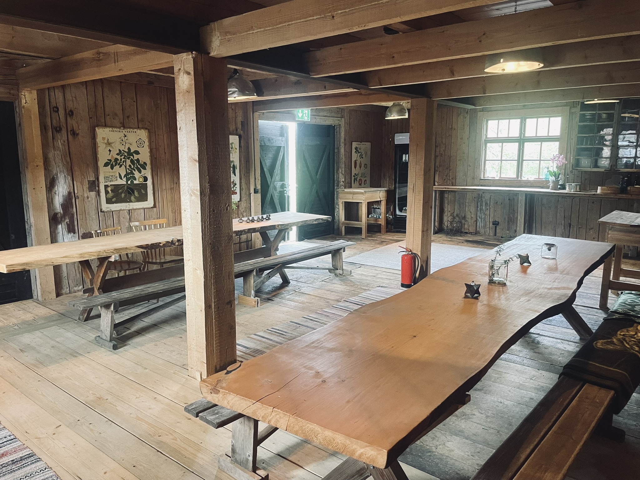 På plan ett finns kök och toaletter samt servering eller den ”lilla” festlokalen. På plan två finns den stora ytan bevarad med plats för både sittande och dansande gäster. Vi har plats för ca 40 sittande personer i serveringen på plan ett och 50-70 sittande på andra våningen. I de här lokalerna, med enbart timmerväggar, är det varmast under den varmare årstiden, men kamin och fläkt värmer upp till behaglig temperatur även under vintern.